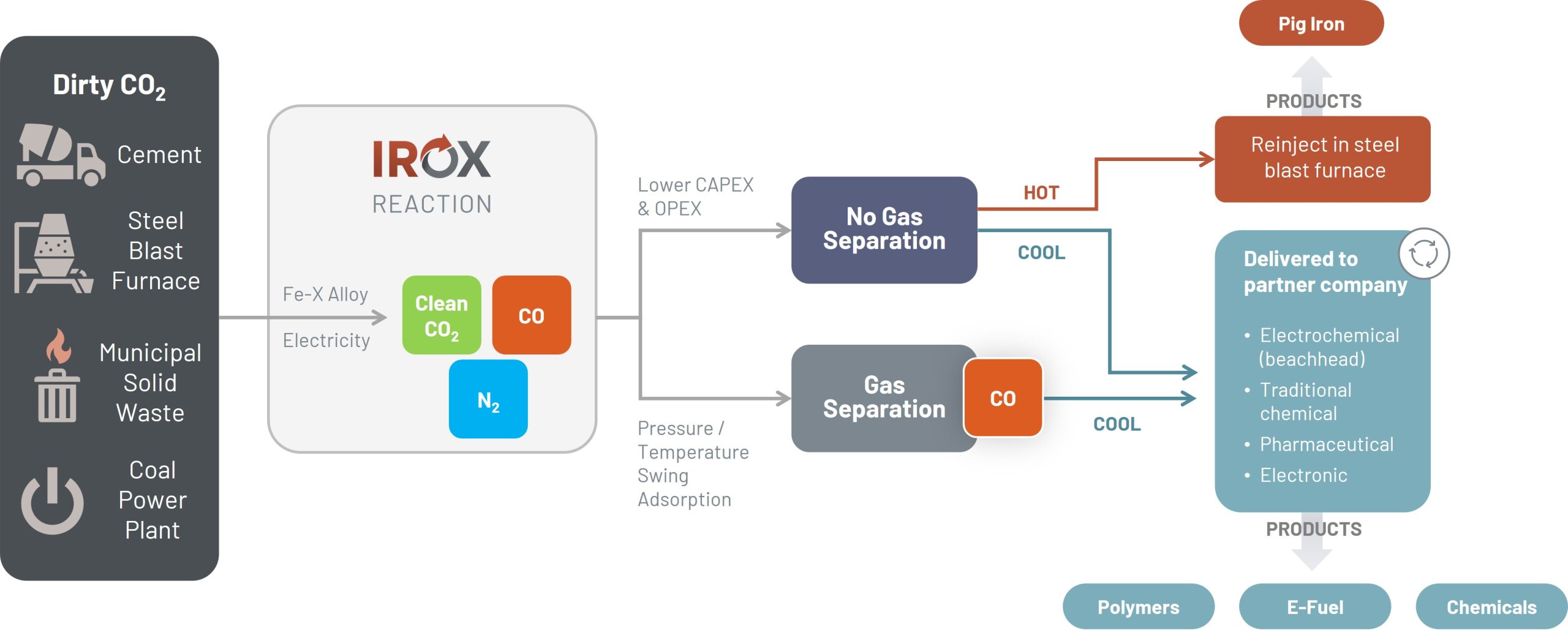 IROX both captures and purifies raw carbon emissions to transform them into a more valuable product and essential manufacturing gas, carbon monoxide.